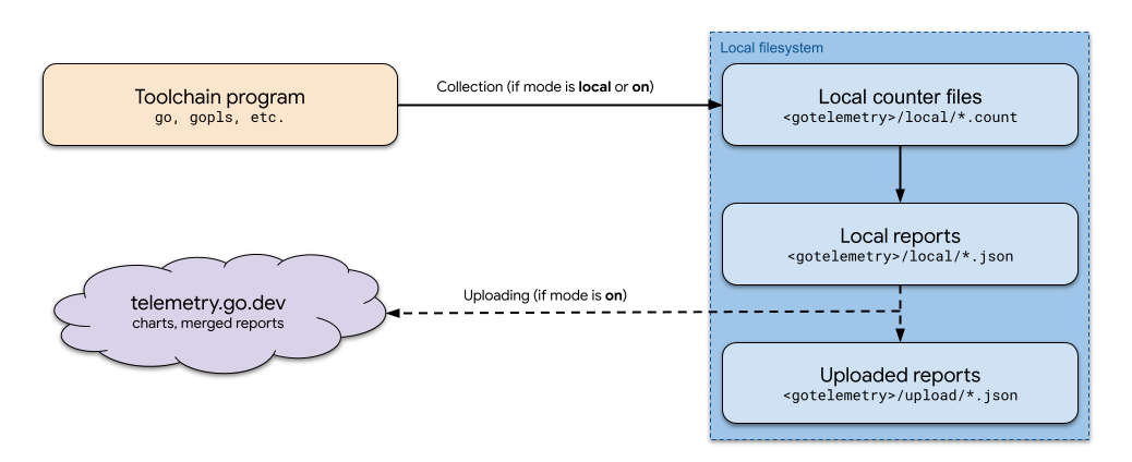 Theo mặc định, dữ liệu telemetry chỉ được lưu trên máy tính cục bộ, nhưng người dùng có thể chọn tải lên một tập con được phê duyệt của dữ liệu telemetry lên telemetry.go.dev. Dữ liệu được tải lên giúp nhóm Go cải thiện ngôn ngữ Go và các công cụ của nó, bằng cách giúp chúng tôi hiểu mức sử dụng và các sự cố.